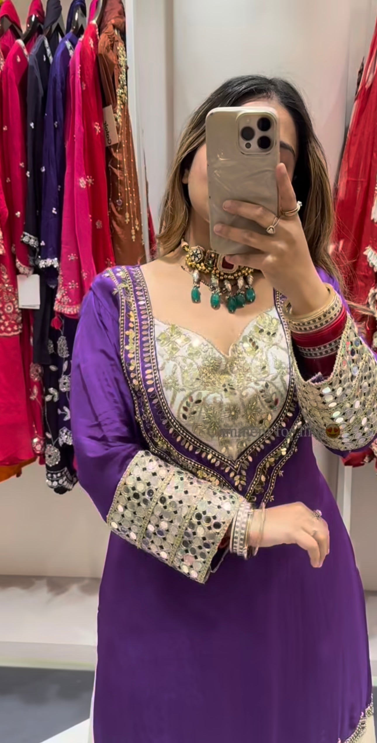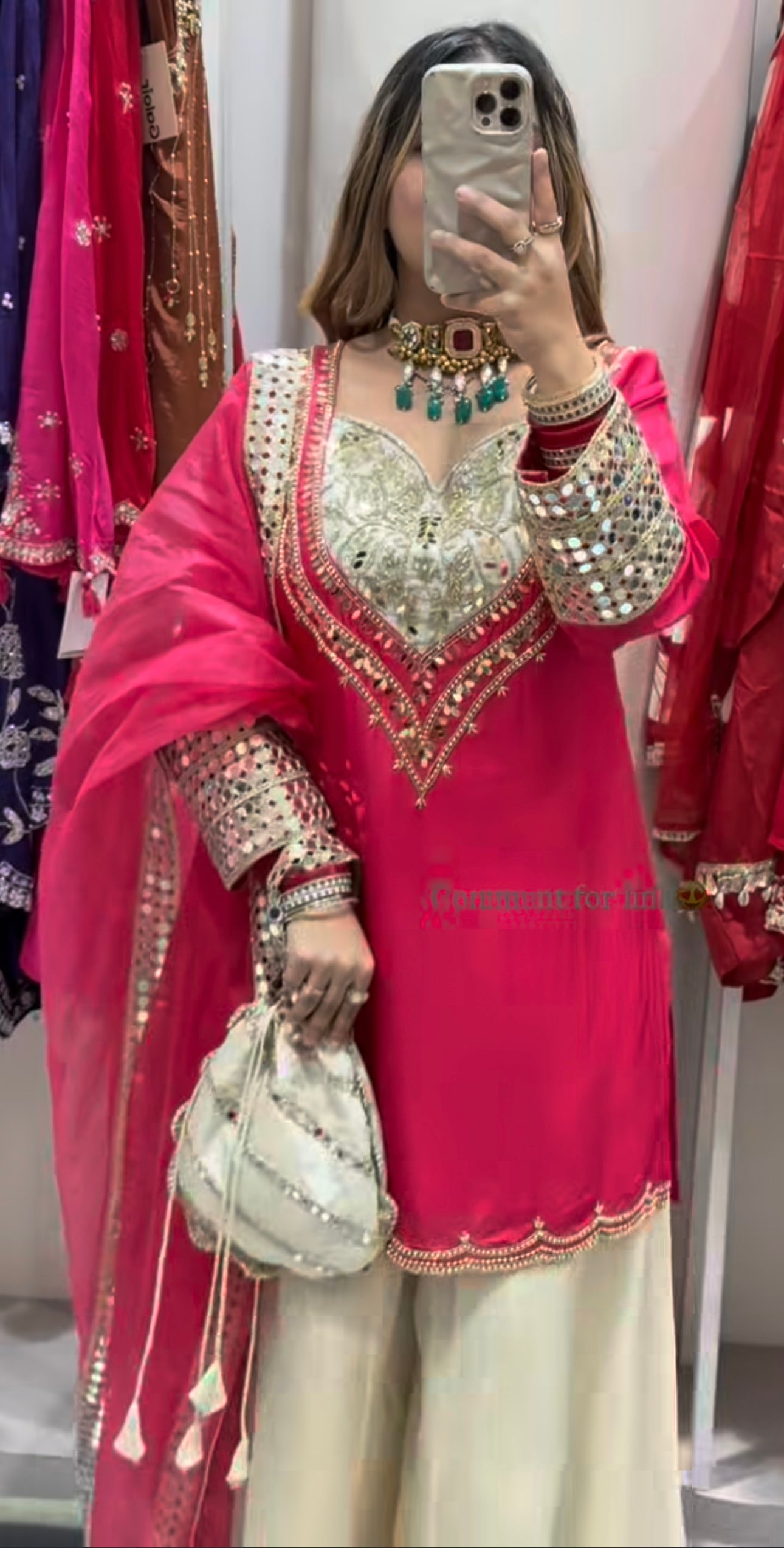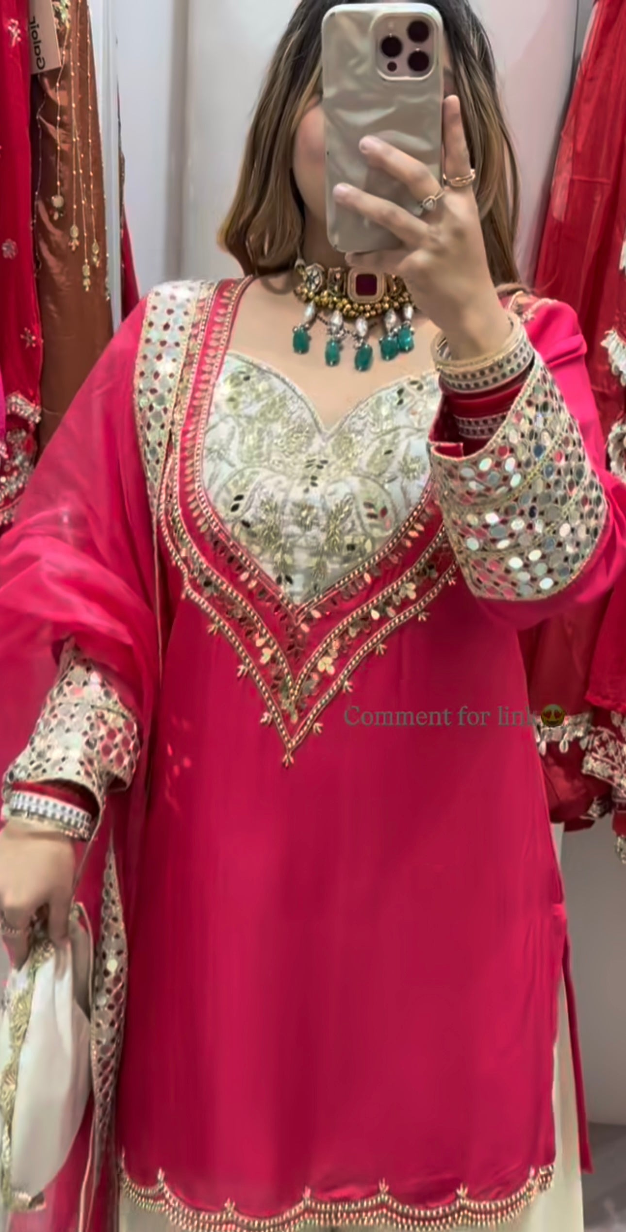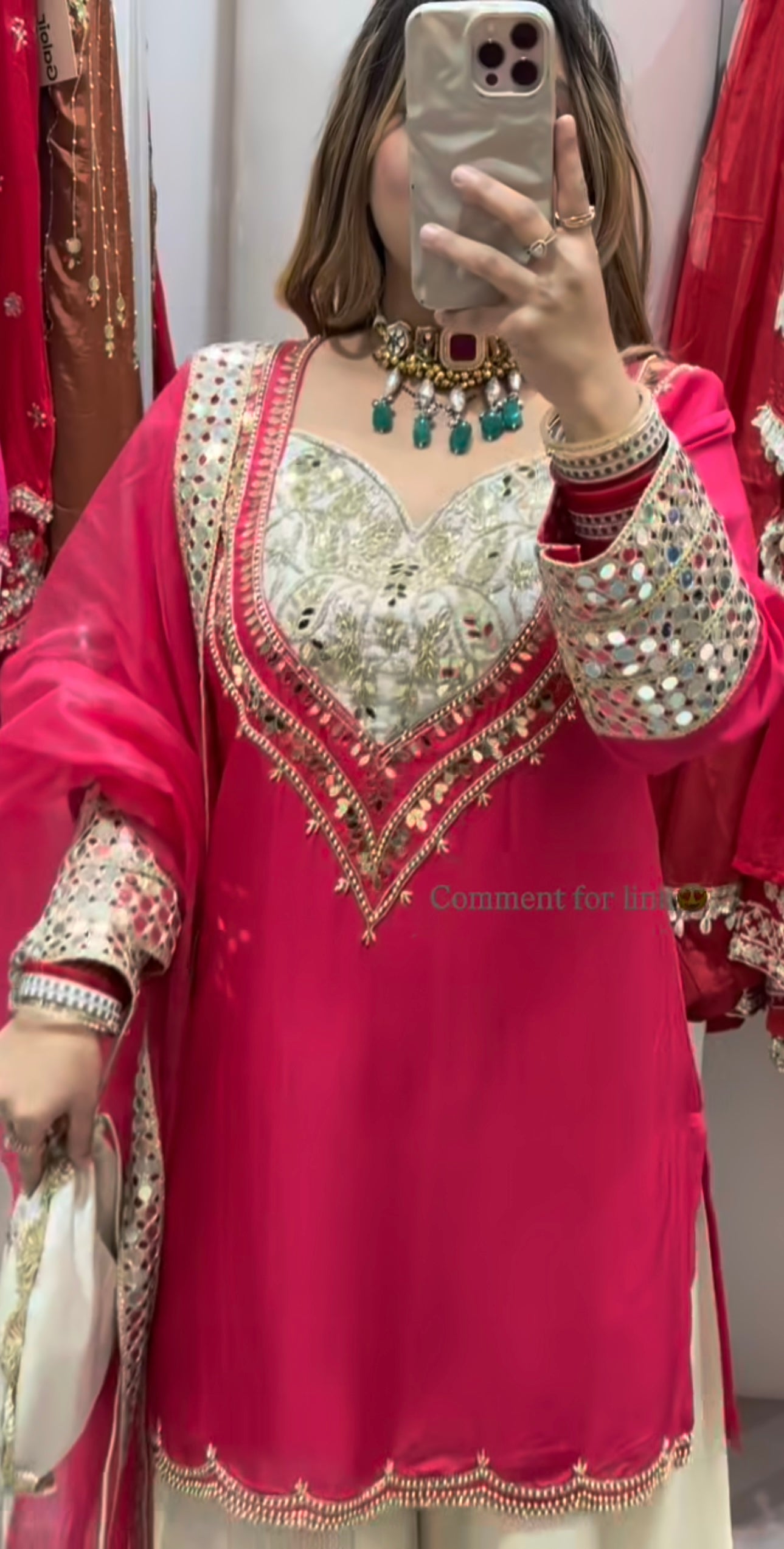Step into timeless elegance with “Bandagi”, a luxurious 3-piece ensemble crafted in rich Natural Crepe with original 12mm mirror work embroidery. Perfect for weddings, parties, and festive occasions, this outfit is where regal charm meets effortless comfort. 💃👑