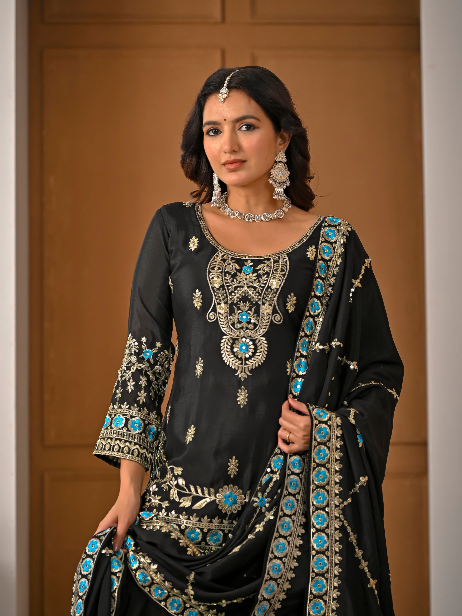Add timeless elegance to your ethnic collection with this Black Embroidered Sharara Suit Set, crafted from premium Heavy NC Vichitra Silk fabric. Designed for festive occasions, weddings, and traditional gatherings, this outfit combines rich embroidery with comfortable wear.