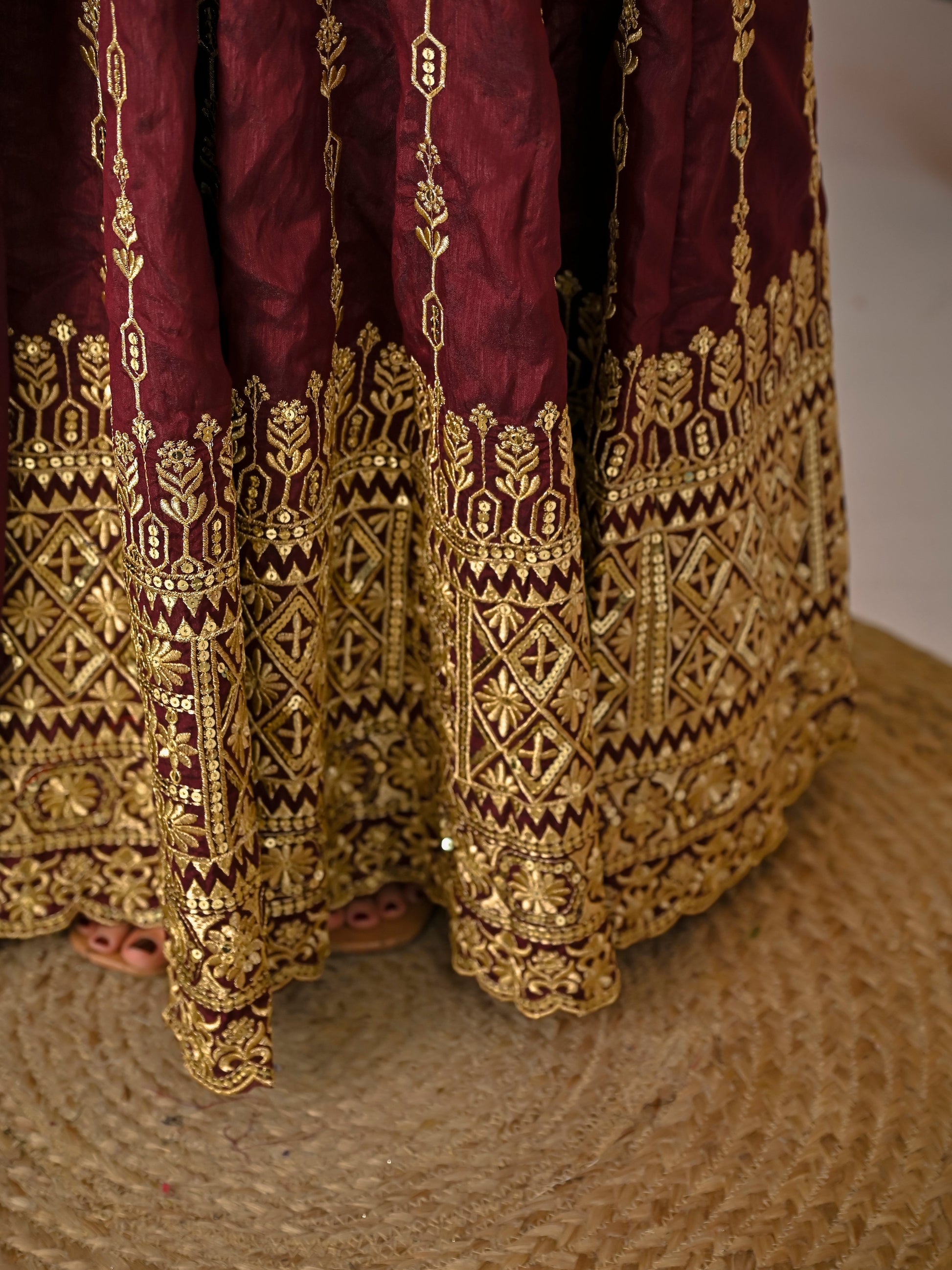 Best styled with chandbali earrings and embroidered potli bag. Ideal for mehendi and festive day events.